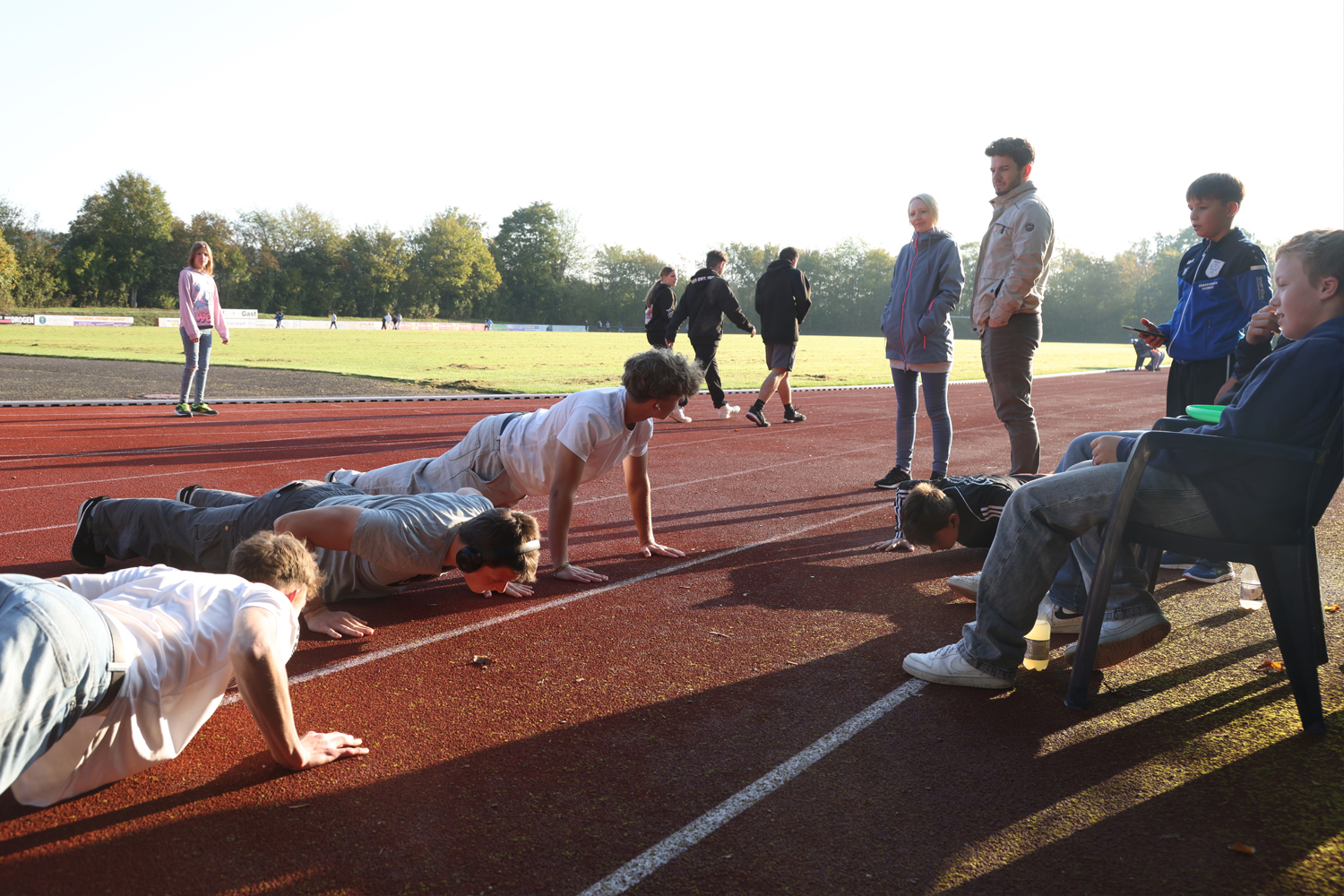 Kinder laufen für Kinder: unter diesem Namen findet jährlich der Sponsorenlauf statt. Die Durchführung übernahm wieder einmal Jessica Gabold mit ihrer Klasse, der 9aM. Ein gut eingespieltes Team sorgte sich darum, dass die Kinder geordnet den Lauf starteten, gaben die verdienten Bändchen für jede gelaufene Runde aus und rechneten am Ende die Summe der erlaufenen Spendengelder aus. Wie viel das war, hing davon ab, wie viele Spender gefunden wurden, wie viel die Spender pro Runde spenden wollten und natürlich auf die Anzahl der erlaufenen Bändchen. Ach so: Natürlich konnte man diese auch wieder zusätzlich zum Lauf durch Liegestütze und Burpees verdienen.